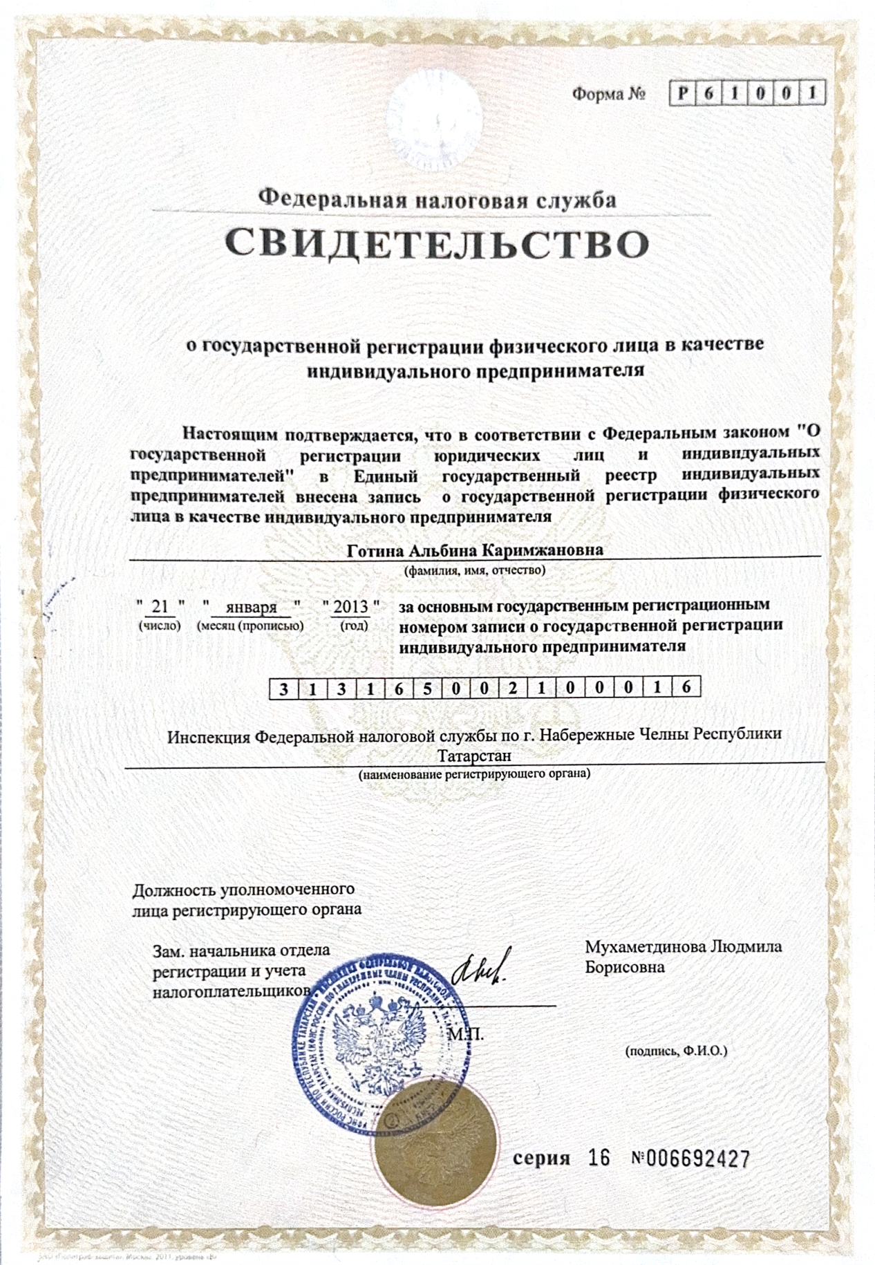 ОГРНИП 313165002100016, ИНН 162701218391